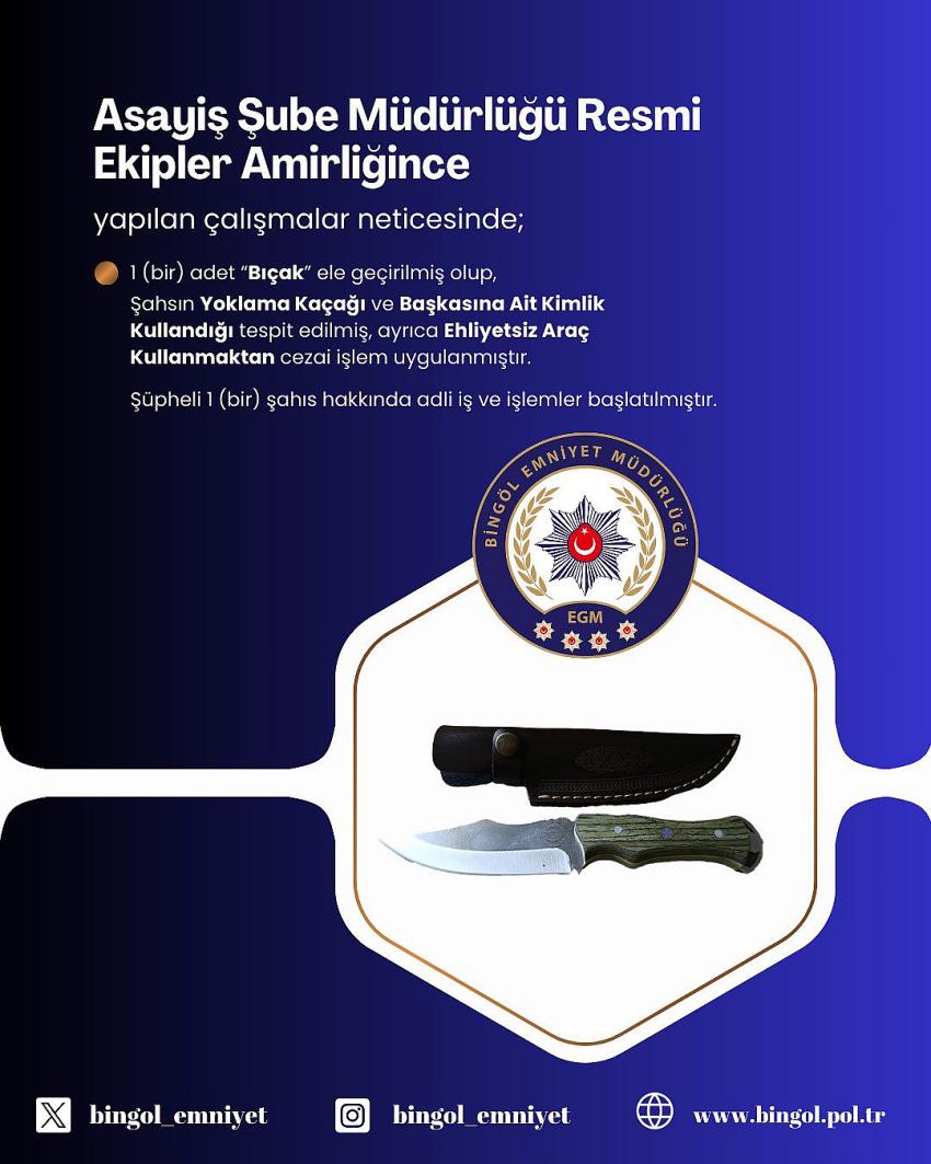| Suç kaydı bulunup aranan bir şahıs, üzerinde bıçak, başkasına ait kimlik ve ehliyetsiz araç kullanırken yakalandı. | ||