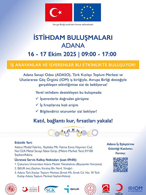 Uluslararası Göç Örgütü (IOM) ve Adana Sanayi Odası, Avrupa Birliği’nin (AB) finansal desteğiyle, ilgili kamu kurumları ve yerel paydaşların iş birliğinde istihdam fuarı ve iş eşleştirme etkinliği düzenlenecektir.